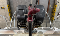 The Firehawk (Fire model) also provides up to 2200 GPM fire pump and Twin fire monitors for fire suppression (water and foam) and “dewatering pump out” capabilities. The below deck fire pump is directly plumbed through the keel. The pump is always primed and can supply water with a turn of a key for the fire pump engine. NFPA 1925 Compliant System. Pump can flow water from 2 integrated monitors (1 bow, 1 stern) or flow water to hose through a 4.5″ stortz and/or 2x 2.5″ threaded couplings