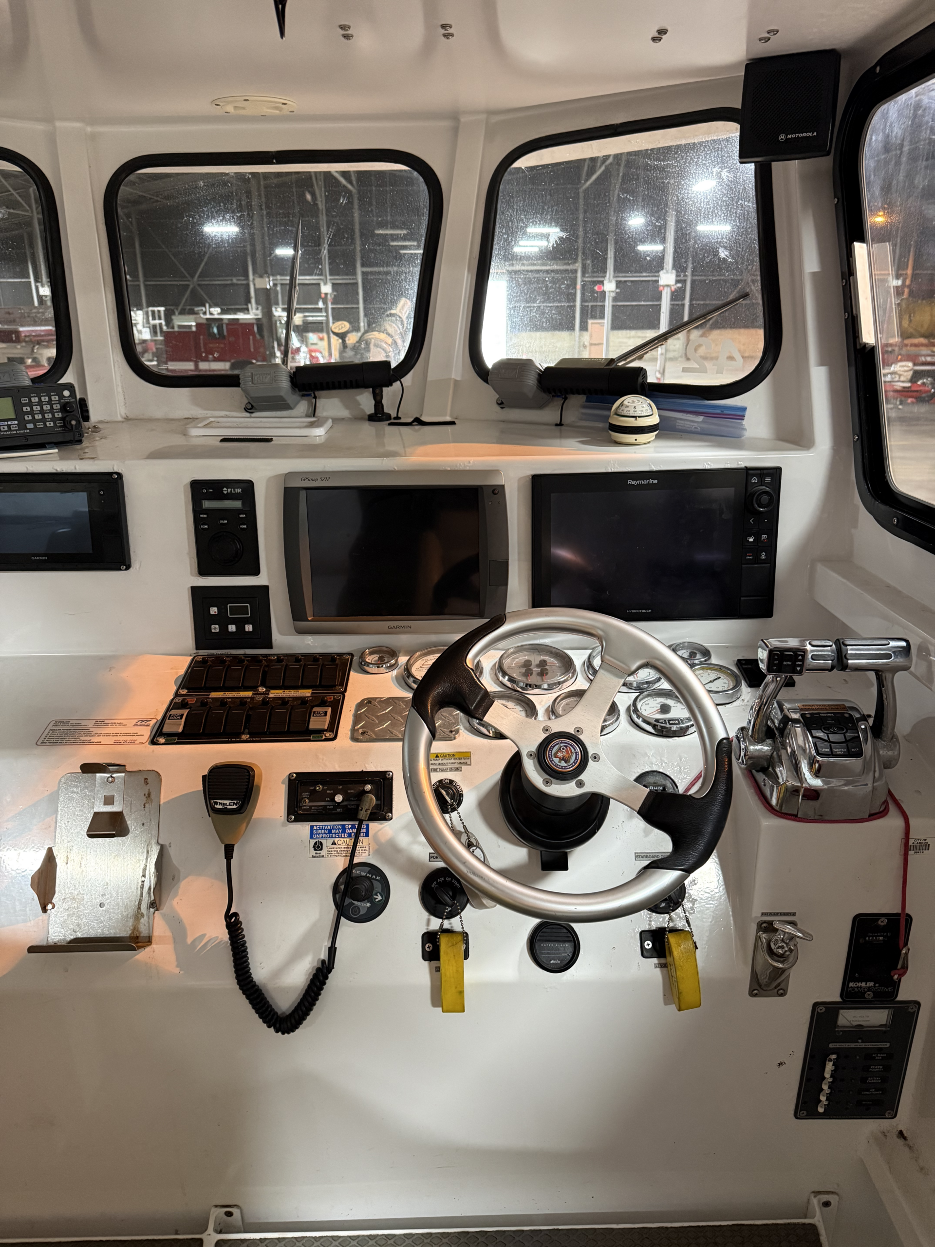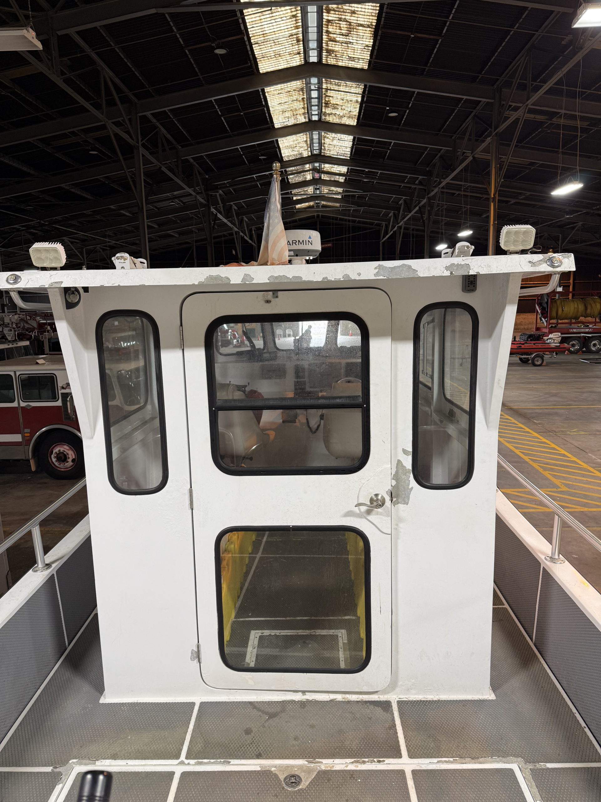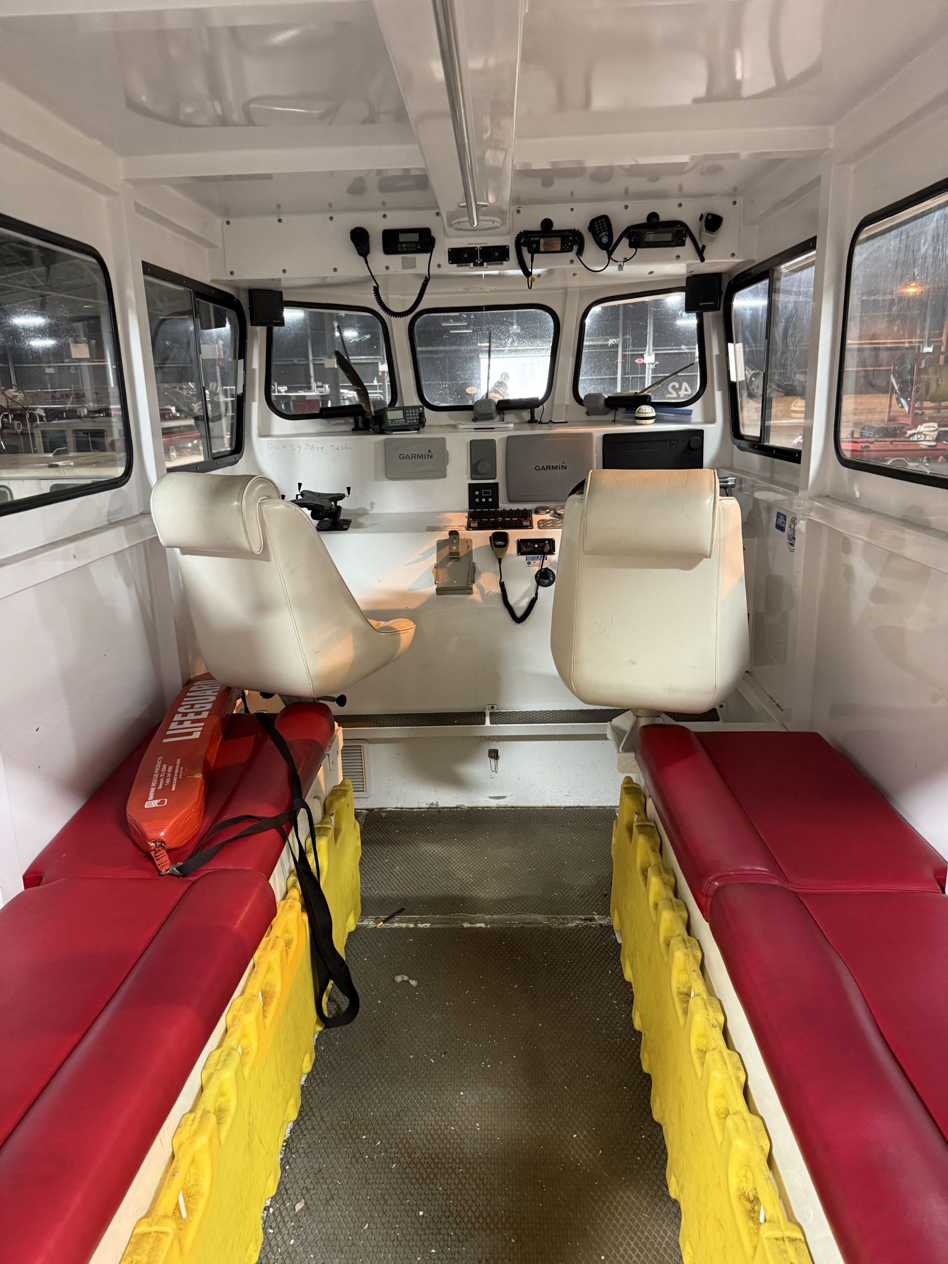 Electronics : Raymarine Hybrid touch display and a Garmin GPS map 5212 display installed for FLIR, Radar, GPS, depth, speed, and navigation information. Whelen WPA series hailer and siren. FLIR M-324XP camera. Garmin closed array radar antenna on cabin roof.