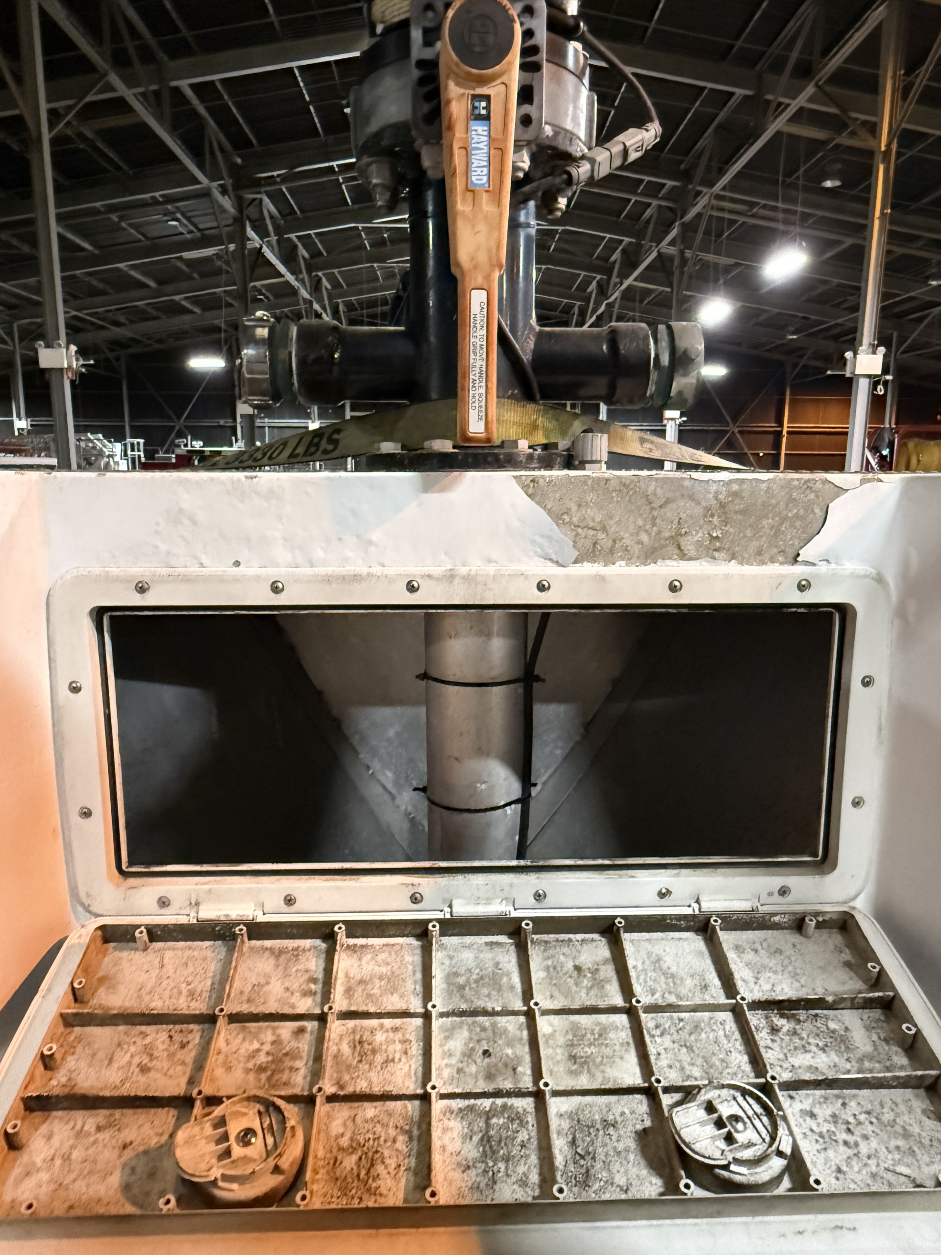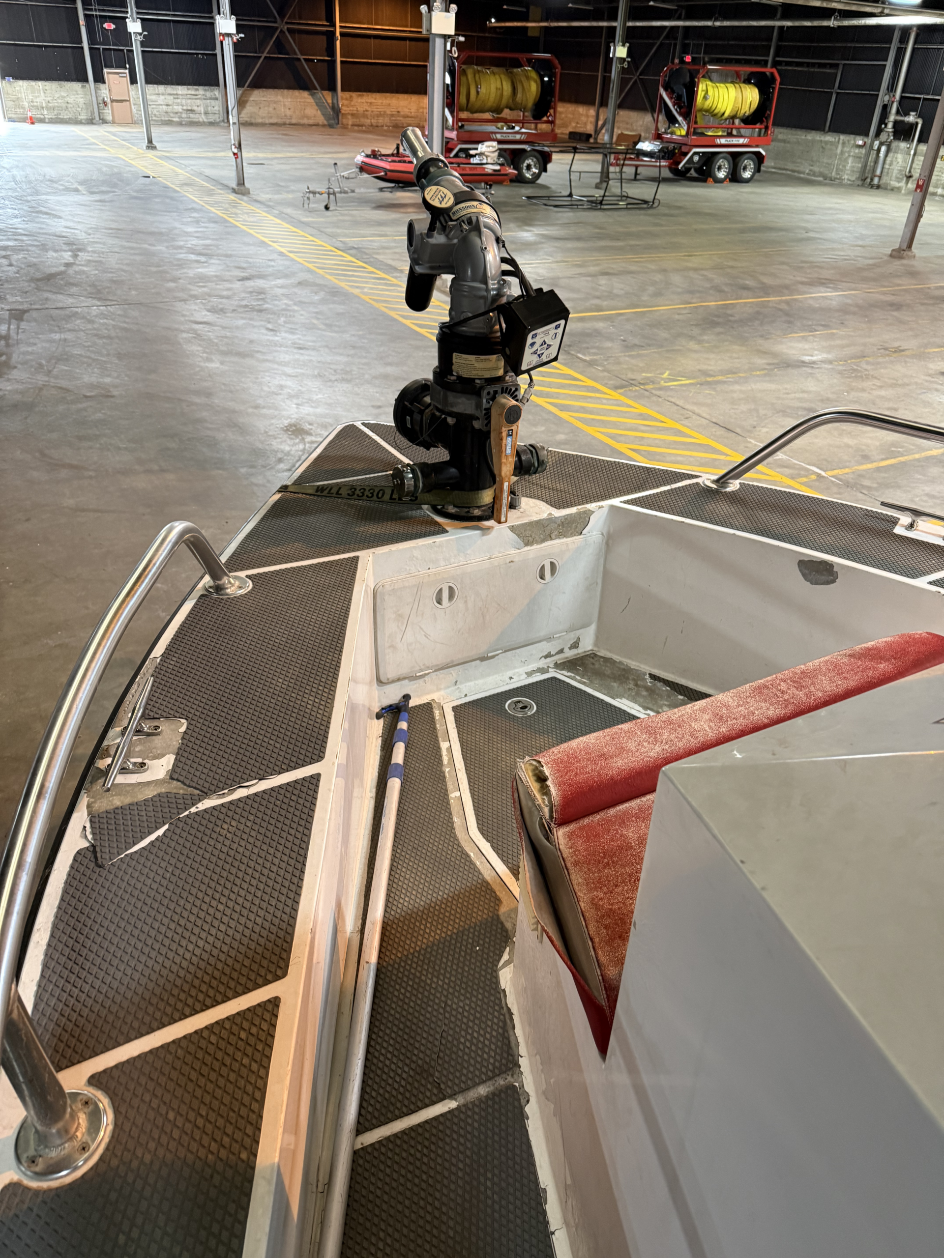 below the aft cockpit deck connected to an American Turbine Pump model J120-AT firefighting pump with a 2,200 gpm capabilities.