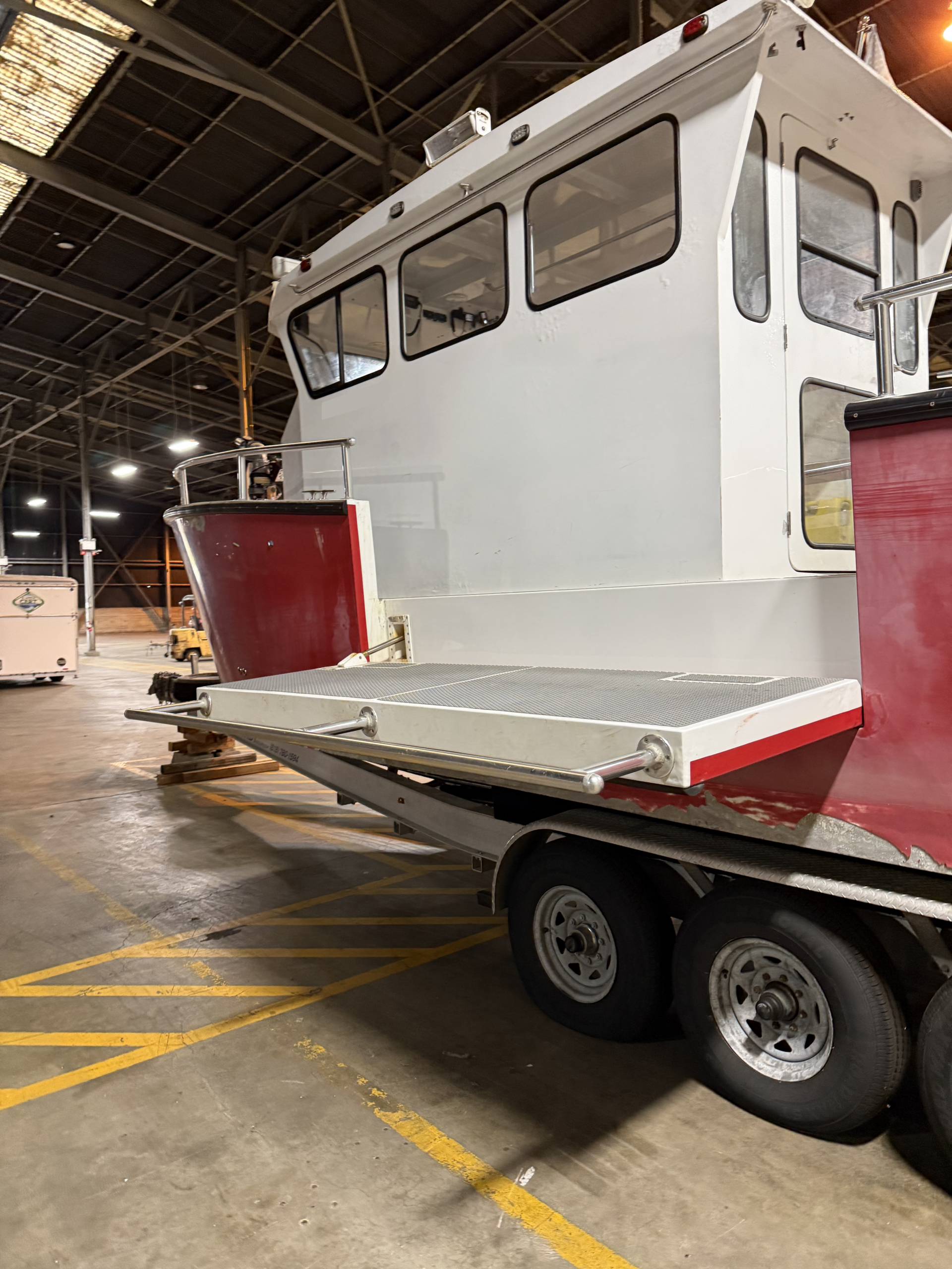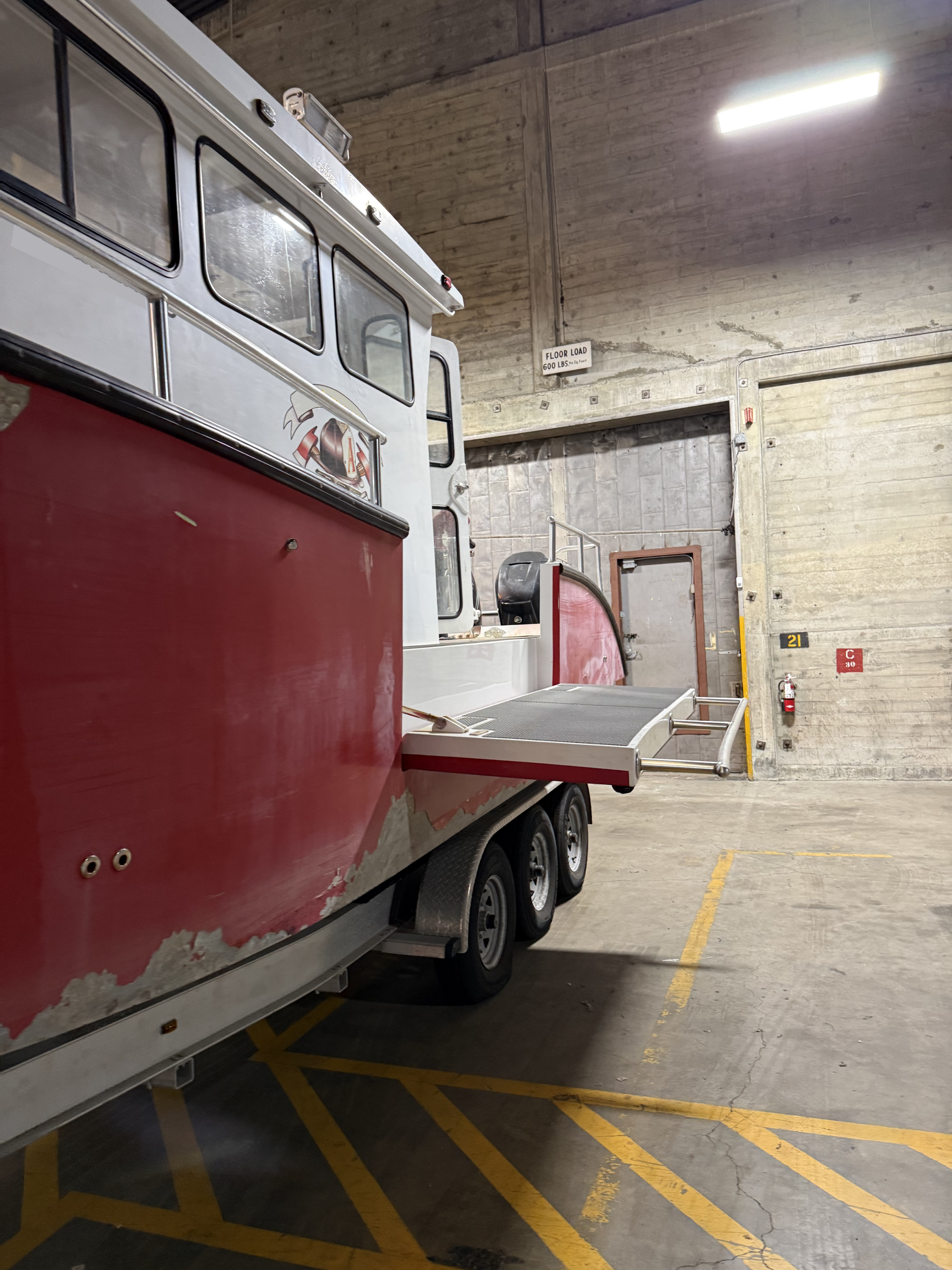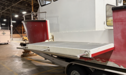Patented – Dual 8′ collapsible dive platform doors. These doors are electrically controlled from the drivers helm. The doors float on the waterline when completely lowered providing multiple patient access in a rescue situation. These doors also provide a flat waterline platform for dive exercises and rescue basket area for easier helicopter attachment and removal.